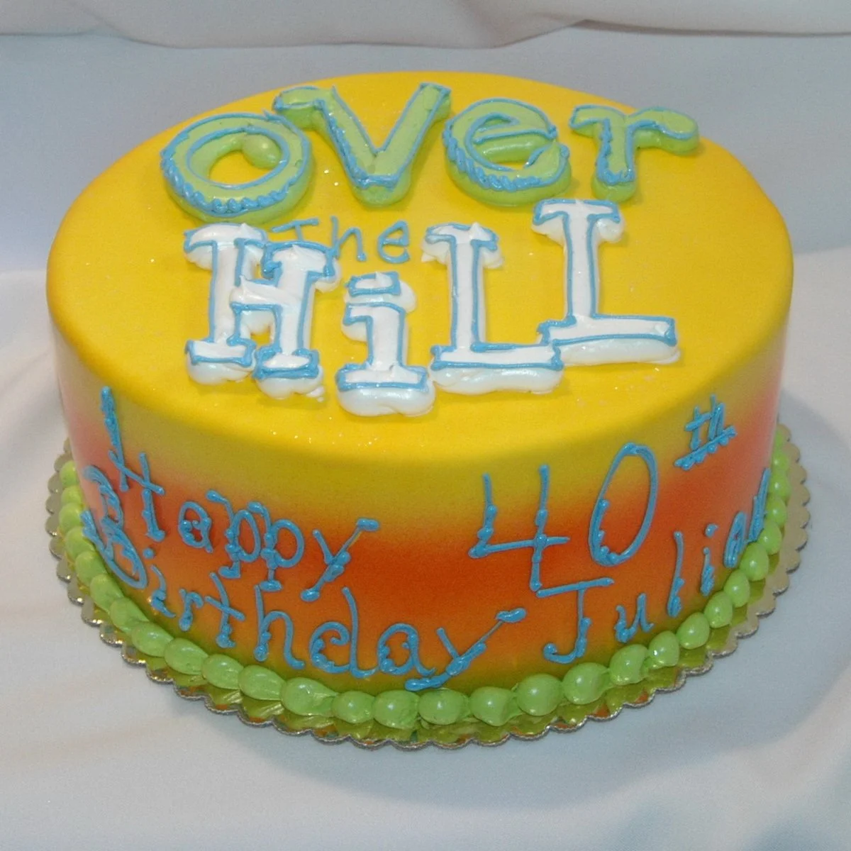 Mark milestone birthdays with this "Over the Hill" cake. Customize the colors and add your own inscription for a memorable celebration. Place your order at least one week in advance to ensure perfection.